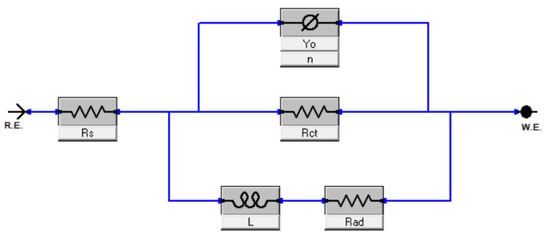 To further elaborate the coatings performance, an electrical equivalent circuit (EEC) was fitted (goodness of fit ≤10−3). Figure 9 illustrates the EEC model and Table 2 presents all attained circuit values from fitted curves, where Rs, Rct, Rad, L, Yo, and n are solution resistance, charge transfer resistance, adsorbed species resistance, inductance, admittance, and dimensionless coefficient, respectively. EPD-GO-W had ~6× better Rct (873.5 Ω×cm2), EPD-GO-E had ~4× better Rct (601.2 Ω×cm2), and EPD-GO-A had ~2× better Rct (242.9 Ω×cm2) than that of bare Mg (150.3 Ω×cm2), which validated Tafel results. Also, Rad for the EPD-GO-W coating on Mg sample was highest (299.2 Ω×cm2), indicating a more compacted and adherent double layer of EPD-GO coatings and electrolyte, respectively, to resist further corrosion. Due to the swelling effect of the EPD-GO coatings, as there may have been some partially reduced GO present on coatings and their hydrophilic nature, the admittance (Yo) values of EPD-GO coatings were lower than the values for bare Mg [30]. The equivalent inductive behavior observed in the low frequency showed GO coatings are advantageous for molding the depletion rate of the Mg alloys without impairing the characteristics of the underlying metal. A dimensionless coefficient (n) was introduced to fix deviation in admittance which suggests the surface roughness, compactness, cracks, and porosity of the deposited coatings. High and low values of n indicate better capacitive behavior and highly porous and rough surface of deposited coatings, respectively [71,72]. Here, Table 2 shows the highest value of n for EDP-GO-W, while the lowest comparable values for other EPD-GO-coated Mg samples, indicating better coverage with low roughness for EPD-GO-W coatings and well validated, with the Tafel, AFM and SEM results.