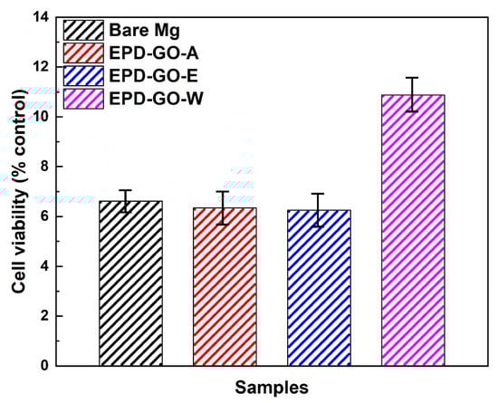 To identify the cell toxicity/biocompatibility of uncoated and GO-coated Mg samples, the mouse MC3T3-E1 cell line from American Type Culture Collection (ATCC) was used. Prior to the direct cell seeding process on the samples, the samples were sterilized under UV radiation for at least 2 h. 1 × 106 cells per ml were seeded in a 96 well plate and incubated in Dulbecco’s Modified Eagle’s Medium (DMEM, Gibco, Thermo Fisher Scientific, Waltham, MA, USA), accompanied with 10% fetal bovine serum (FBS) and 5% Penicillin/Streptomycin in a humidified atmosphere with 5% CO2 at 37 ± 1 °C. Six wells were assigned to each group of samples, while cells cultured with normal DMEM were taken as control (negative control). Cell viability was evaluated by using the standard MTT assay protocol after 72 h incubation. Olympus fluorescence microscope (Tokyo, Japan) was used to observe morphology and attachment of cells. After 72 h, MTT, at a concentration of 10 µL, was added per well and was left to rest to allow crystallization for 4 h and further; upon removal of MTT, these crystals were left to dissolve in 100 µL (CH3)2SO per well for almost 15 min and were transferred to the ELISA reader plate (BioTek microplate reader, Winooski, VT, USA) for measurement of absorbance of each well at 490 nm wavelength. The percentage of cell viability was determined using the following Equation (1), where OD represents the optical densities [47].