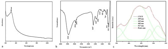 An analysis of the spectra of CuO-TiO2-chitosan-escin nanocomposites. The UV-vis spectrum of nanocomposites (a). FTIR transmittance vs. wavenumber plot of nanocomposites (b). Photoluminescence spectra from nanocomposites (c).