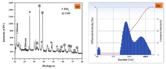 The dynamic light scattering (DLS) nano plus instruments were used to determine the average size of the nanocomposites. Under stable conditions, the Z-average mean diameter (d [nm]) of the CuO-TiO2-chitosan-escin nanocomposites was 116 nm, and the polydispersity index (PDI) was 0.283 with a refractive index of 1.3328. The peak, however, strongly indicates that the particles were mono-dispersed, as seen in Figure 2b.