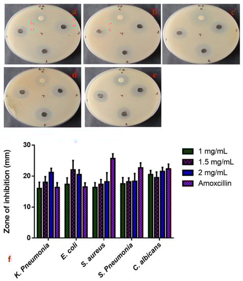 The anti-microbial properties of CuO-TiO2-chitosan-escin nanocomposites were evaluated using a simple well diffusion method. We also investigated the anti-microbial efficacy of various concentrations of CuO-TiO2-chitosan-escin nanocomposites (1, 1.5, and 2 mg/mL) against S. aureus, S. pneumonia, K. pneumonia, E. coli, and C. albicans strains, as shown in Figure 4a–e. Both the CuO-TiO2-chitosan-escin nanocomposites and the conventional antibiotic amoxicillin show anti-microbial effects. Increasing the concentration of CuO-TiO2-chitosan-escin nanocomposites also increased the anti-microbial effects (Figure 4). The anti-microbial mechanisms for the intercellular activity of CuO-TiO2-chitosan-escin nanocomposite are explained as follows. CuO-TiO2-chitosan-escin nanocomposites could bind to the surface of microbial membranes, inhibiting protein synthesis and nutrient uptake and, consequently, reducing cell growth and viability. Moreover, the electrostatic communication of CuO-TiO2-chitosan-escin nanocomposites on the bacterial surface membrane might have a positive, negative, or neutral charge, which could lead to the collapse of the electrostatic balance on the bacterial surface and create a hole pair on the outer membrane, subsequent in the protein leakage, DNA, RNA, and lipids and, ultimately, cell death. Another possible bactericidal mechanism of nanocomposites could be due to the generation of ROS, which interacted with bacterial membranes, ensuing in the lysis of cell walls and, ultimately, cell death [].