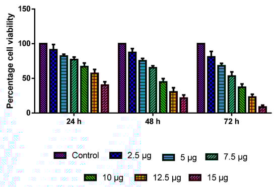 MOLT-4 cells are cytotoxic to nanocomposites of CuO-TiO2-chitosan-escin. A range of doses (2.5, 5, 7.5, 10, 12.5, and 15 µg/mL) of CuO-TiO2-chitosan-escin nanomaterials were used for 24 h, 48 h, and 72 h in order to evaluate their effects on MOLT-4 cells. The MTT assay was performed on the cells, and the outcomes are illustrated as the mean ± SD of triplicates.