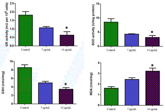 Finally, to confirm the stimulation of apoptosis events in the nanocomposites administered with MOLT4 cells, we identified CuO-TiO2-chitosan-escin nanocomposites by their ability to produce ROS, oxidative stress, and by penetrating the mitochondrial membranes of MOLT4 cells, which could lead to an increase in caspase activation. MDA is a primary products of lipid peroxidation; thus, its level represented the rate and intensity of lipid peroxidation in the cells. Compared with the control cells, CuO-TiO2-chitosan-escin nanocomposites (7 and 14 µg/mL) considerably increased MDA levels (nmol/gm) and significantly decreased GSH, SOD, and GR activities (p < 0.05).