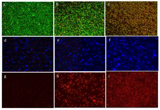 Detection of apoptosis through fluorescence microscopy in cells after treatment with CuO-TiO2-chitosan-escin nanocomposites. In vitro treatment with nanocomposites (7 and 14 µg/mL) was carried out for 24 h in MOLT-4 cells. AO/PI was used to stain the cells on the top panels; DAPI was used for the middle panel, and propidium iodide (PI) was used for the lower panel. In the panels on the right, untreated cells served as controls (a,d,g), and the middle panels (b,e,h) were treated with Cuo-TiO2-chitosan-escin nanocomposites (7 μg/mL). Left panel samples (c,f,i) were treated with Cuo-TiO2-chitosan-escin nanocomposites (14 μg/mL). These images were obtained at 20× magnification; the experiments were conducted in triplicates; the scale bar was set to 100 μm.