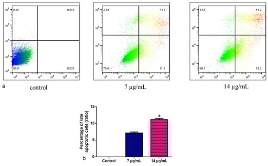 The cell deaths revealed that CuO-TiO2-chitosan-escin nanocomposites caused either apoptosis or necrosis. This study used annexin V/PI double-labeling and flow cytometry to analyze phosphorylated serine externalization. To detect apoptotic cells, we used distinct double staining patterns: viable cells (Annexin V- and PI-, lower left square), early apoptotic cells (Annexin V+ and PI-, lower right square), late apoptotic cells (Annexin V+ and PI+, upper right square), and necrotic cells (Annexin V- and PI+, upper left square). The addition of the nanoparticles (Figure 9a) increased the amount of late apoptotic cells. Approximately 7.12% of apoptotic cells were induced by CuO-TiO2-chitosan-escin nanocomposites at a dose of 7 µg/mL, whereas 11.2% were induced at a dose of 14 µg/mL (Figure 9b). The control cells had 0.018% late apoptotic cells. CuO-TiO2-chitosan-escin nanocomposites inhibited MOLT-4 cell proliferation and induced apoptosis, consistent with MTT results.