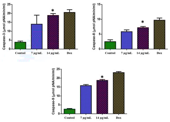 Activation of caspase-3, -8, and -9 in MOLT-4 cells. The level of pro-apoptotic proteins (Caspase-3, -8, and -9) expressed in MOLT-4 cells following treatment with the IC50 concentration (7 and 14 µg/mL) of nanocomposites and untreated control cells were measured. Values were illustrated as the mean ± SD of triplicates. * p < 0.05 vs. control.