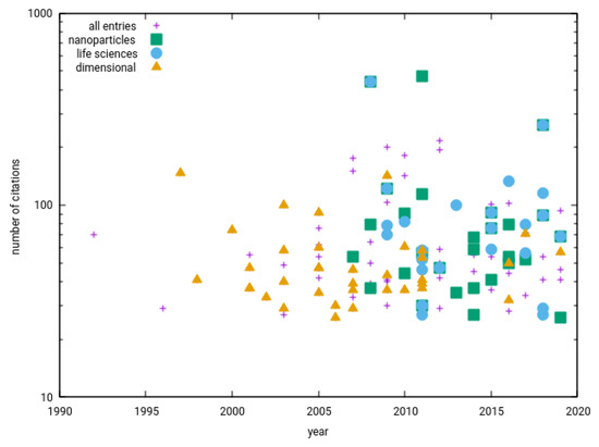 Looking from the perspective of metrology institutes, we can see that 30% of papers have at least one author from NMI; 32% are related to metrological traceability and 58% to uncertainties and error sources, but only 12% deal with some kind of methodological comparisons between different instruments, methods or laboratories. The wide range of measurement topics related to optics (including, e.g., optical microscopy, plasmonics or Raman microscopy) is covered by 37% of papers, while the much narrower field of Scanning Probe Microscopy is covered in about the same number, 36% of the papers. Classical dimensional metrology topics, such as building interferometers for providing metrological traceability up to the smallest movement scale, are discussed in 31% of papers. More complex analytical techniques such as X-ray-based surface and thin film analysis are found in only 21% of selected papers. Many of the expected topics have quite low numbers of papers, e.g., methods for thin film analysis are developed in only 6% of the papers (even though many of the other methods can, in principle, be used for thin films as well). There is a lot of variety in the studied materials and sample types, out of which there is one larger group (21%) of papers related to the analysis of nanoparticles. Only 18% of the selected papers are related to the very broad area of life sciences, mostly focusing on nanoparticle toxicology. In Figure 1, we can also see how the distribution of these papers’ topics evolves over time. We can see that from about 2007 there is a large growth in fields other than traditional dimensional metrology, progressing towards nanomaterials and life sciences, and such papers even seem to have much larger citation potential. Looking at the collected information, one would guess that before 2007 a typical “nanometrologist” worked at a national metrology institute and was dealing with Scanning Probe Microscopy. This is no longer the case, even if there are still a number of scientists working in this area, including the author of this editorial.