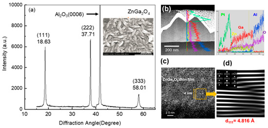 Before studying the structure’s effect on the response of the gas sensor, the material properties of the as-grown film were characterized by XRD, SEM, TEM, EDS, and XPS. As shown in Figure 2a, the 2θ-scan XRD pattern reveals only three main peaks located at 18.63, 37.71, and 58.01o indexed corresponding to the (111), (222), and (333) of ZGO, respectively, and one peak from Al2O3(0006) located at 41.7° [21]. The result indicates that the film might be grown in a highly-oriented single crystal spinel ZnGa2O4 (ZGO) structure. The inset of Figure 2a shows the surface morphology of the ZGO film measured by SEM. Apparently, the ZGO film consisted of nanospindles with a dimension in length and width of about 120 nm and 40 nm, respectively. Such a nanospindle structure gives rise to an increasing surface-to-volume ratio, which would enhance the performance of the gas sensor. To ensure the formation of the spinel ZGO structure, the microstructure and elemental distribution of the film were further investigated by TEM and EDS. Figure 2b shows a bright-field TEM image and a corresponding EDS line scan across from the surface towards the substrate. The uneven surface reflects the nature of the formed nanospindle structure. The elemental line profiles can be divided into three distinct regions: (i) surface coated Pt film; (ii) nanospindle film composed of Ga, Zn, and O; and (iii) sapphire substrate composed of Al and O. The intensity of elemental profiles evolutes with the same trend, revealing a thickness dependence, and indicating a uniform compositional distribution without obvious phase separation throughout the entire film. The microstructure of the film characterized by high-resolution TEM, shown in Figure 2c, clearly presents atomic-resolved crystalline lattices despite forming a granular structure. Figure 2d shows a Fourier-filtered lattice-plane image taken from the area marked with an orange rectangle in Figure 2c. Although some misfit dislocations were formed between grains, the lattice is still resolved. The interplanar spacing of the lattice was calculated to be 4.816 Å, which matches well with the interplanar spacing of ZGO(111). In combination with the corresponding fast Fourier transform pattern, shown in the inset of Figure 2d, we confirm that the film was grown in a spinel ZGO structure, which agrees well with the XRD result.
