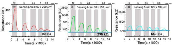 In order to evaluate the effect of sensing area on the NO response, five different concentrations of NO gas (10, 5, 2.5, 1, and 0.5 ppm) were injected into these gas sensors. The operating temperature was 300 °C. Note that the response can be obtained as Rg/Ra. Rg is the resistance of the sensor in the analyzed gas and Ra is Resistance of the sensor in dry air. Figure 5 shows the change in resistance with exposure to NO gas. Figure 5a shows the response diagram of the 60 × 200 μm2 gas sensor. As the concentration decreases, the response also decreases. The responsivities of the five different NO concentrations to the thin film were 5.086, 2.489, 1.936, 1.638, and 1.422. Note that the based resistance of the sensor was about 90 kΩ. Figure 5b shows the response of the 80 × 150 μm2 thin film sensor. The responses to different NO gas concentrations were 4.003, 2.463, 1.856, 1.741, and 1.306. The based resistance of the sensor was 230 kΩ. Figure 5c shows the response of the 120 × 100 μm2 film. The responses to different NO gas concentrations were 1.794, 1.792, 1.549, 1.453, and 1.261, and the highest resistance recorded by the sensor was 550 kΩ. The obtained response for all sensors is shown in Table 1.