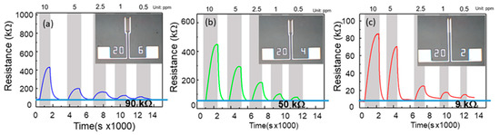 After the fixed-sensing-area test, a sensor with a constant channel width of 200 μm was tested. The samples with different channel lengths of 60, 40, and 20 μm are shown in the inset of Figure 6. NO concentrations of 10, 5, 2.5, 1, and 0.5 ppm were used to examine the response of the sensors. Figure 6 shows the transient response of the resistance of three different sensors with a constant width. Figure 6a shows the responses to five different NO gas concentrations of the films with an area of 60 × 200 μm2, which were 5.086, 2.489, 1.936, 1.638, and 1.242. The based resistance recorded by the sensor was 90 kΩ. Figure 6b is the response diagram of the sensor with 40 × 200 μm2 size; the responses of the sensor were 7.956, 5.448, 3.319, 1.770, and 1.497, respectively. The based resistance recorded by the sensor was 50 kΩ. Figure 6c presents the sensor with a 20 × 200 μm2 area; the responses were 11.647, 8.633, 3.469, 2.453, and 2.105, respectively. The based resistance recorded by the sensor was 9 kΩ.