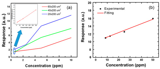 Figure 7 shows the response of the sensors with different values of L as a function of NO concentration. The gas concentration was varied from 0.5 to 10 ppm. At the same electrode width, the shorter channel length exhibited better responses at each concentration. This is consistent with the phenomenon discussed earlier in which, under the same area, a shorter channel length results in greater responsiveness. Although the sensing area is different for the sensors shown in Figure 5, as the channel length becomes shorter, the response increases. It is important to mention that the 20 μm channel length presented the best response among all gas sensors. Nevertheless, the linearity of a gas sensor of 20 μm × 200 μm was not good in the range. It is necessary to undertake further study on the mechanism of non-linearity. In order to evaluate the limitation of the gas sensor with the 20 μm channel length, the inset of Figure 7 shows the response as a function of low NO gas concentration. It was found that the response was 1.05 even when the NO gas concentration was 10 ppb. The NO gas sensor with 20 μm × 200 μm sensing area exhibited linear behavior. Not only that, but the response to high concentrations (>10 ppm) of NO gas was also measured, shown in Figure 7b. The responses were 12.5 and 16 for the 25 and 50 ppm NO concentration, respectively. It also presented linear behavior.