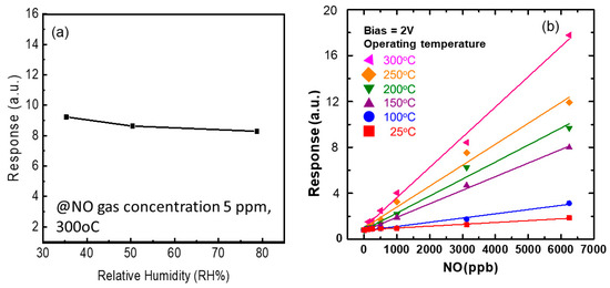 Due to the NO gas presenting a response up to 10 ppb, it has the potential to be applied to asthma care. It is well known that the human exhaled breath contains a large amount of water. Thus, the evaluation of the effect of humidity on the response of the gas sensor is important. Here, the best performance of the gas sensor with the 20 μm × 200 μm sensing area was used to measure the relative humidity (RH) 35.3, 50.4 and 78.7%. As the NO gas concentration was 5 ppm, the response of the gas sensor operating at 300 °C was 9.228, 8.633 and 8.293 for an RH of 35.3, 50.4 and 78.7%, respectively, shown in Figure 8a. It was found that the response of the ZGO presented a 10% decay as the RH increased. The decay was not obvious because the gas sensor was operating at 300 °C. In order to clarify the effect of operation temperature on the response of the gas sensor, Figure 8b presents the response of the ZGO gas sensor as a function of NO concentration with different temperatures. Obviously, the response increases as NO concentration and operation temperature increase. As mentioned in the XPS analysis, the surface of ZGO absorbed the OH from the environment. It is necessary to desorb the OH and produce more dangling bonds, which contribute to increasing the response of the NO gas sensor.