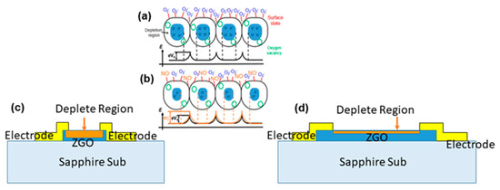 From our previous study, the grains of ZGO nanostructures are covered with adsorbed oxygen molecules before NO injection [21]. Because of the higher electronegativity, the adsorbed oxygen molecules accept electrons from the conduction band of metal oxides and form oxygen ions (O2−) [26,27,28,29,30,31]. As NO is injected into the sensing chamber, the concentration of free charge carriers is reduced because of the removal of electrons from the metal oxide; therefore, a depletion layer is formed at the grain boundaries [29]. Because of the high electron affinity of NO (2.28 eV) compared with oxygen (1.46 eV), the NO molecules interact with adsorbed oxygen ions on the ZGO surface and enhance the potential barrier at grain boundaries, which further increases the resistance.