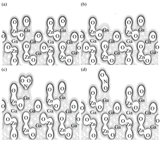 The gas adsorption-induced electrical resistance changes are intimately related to their respective electronic bonding properties. The total charge densities of the oxide-passivation ZGO surface, the oxide-passivation ZGO surface with one surface oxygen removed, and a nitrogen (oxygen) atom from a NO2-like molecule to Ga atoms on the ZGO (111) surface are shown in Figure 11. The contour levels are drawn at intervals of 0.038 electrons Å−3, with the lowest contour level at 0.038 electrons Å−3. Before adsorption of nitric oxide, the charge densities around the oxide-passivation ZGO surface are 0.038 electrons Å−3 irrespective of the presence of surface oxygen being removed as observed in Figure 11a,b. After nitric oxide adsorption, we clearly see that nitric oxide and surface oxygen tend to combine significantly to form NO2 with smooth isosurfaces and the charge density as high as 0.190 electrons Å−3 is localized on the midpoint positions between NO2 and surface gallium atoms as shown in Figure 11c. This suggests that the adsorption of nitric oxide on the surface of ZGO confines the electrons near the adsorption site, which reduces the conductivity and increases the resistance. In the case of a nitrogen atom from an NO molecule bonded to a surface oxygen atom to form a NO2-like molecule with smooth isosurfaces, electrons with a charge density of 0.152 electrons Å−3 occupy the midpoint positions between NO2 and surface gallium atoms as shown in Figure 11d.