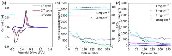 The electrochemical performance of 2D α-Ge anodes was evaluated by cyclic voltammetry (CV), galvanostatic charge/discharge cycling (GCD), and electrochemical impedance spectroscopy (EIS). Figure 2a shows the cyclic voltammetry of 2D α-Ge with 1 mg cm−2 in the potential range of 1.5 to 0.02 V vs. Li/Li+ at a scan rate of 0.1 mV s−1 for the first three scans.