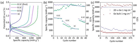 Additionally, a half-cell with bulk Ge as an anode active material was evaluated under the same conditions as the 2D α-Ge material (Figure 3c). The results show a specific capacity of 353 mAh g−1 at cycle 100, which remains constant up to about cycle 400, significantly lower than that obtained by 2D α-Ge (697 mAh g−1).