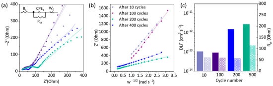 All results for the rest of the experiments are collected in Figure 4c and Table S2. There is a compromise between the charge transfer resistance and the Li+ ion diffusion since it is observed that as the number of cycles increases, Li-ion diffusion increases as well, but the resistance to charge transfer becomes higher. Therefore, there is a trade-off two between the two variables and the battery performance with high-capacity values and good cyclability without too many losses.