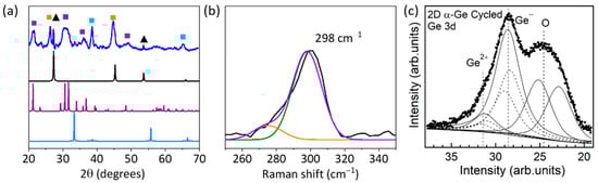 (a) PXRD pattern of 2D α-Ge anodes after the cycling process (blue line), simulated Li2CO3 (purple line), and simulated Li2O (blue line). Black triangles are assigned to Ge-crystalline, purple squares are assigned to Li2CO3, blue squares are assigned to Li2O, orange squares are assigned to VGCF, and green squares are assigned to Cu. (b) Raman spectrum of 2D α-Ge after the cycling process. Raman spectrum measurement (black line), deconvoluted contributions of crystalline α-Ge at 298 cm−1 (green line), amorphous Ge at 275 cm−1 (orange line), and cumulative plot of both contributions (purple), laser power of 1.75 mW. (c) Ge 3d and O 2s XPS peaks (hν = 1253.6 eV) for 2D α-Ge anode after the cycling process. Experimental data (dotted line) and resulting fit (thick continuous lines). Thin lines correspond to the different contributions and dashed lines to the spin-orbit splitting of Ge 3d.