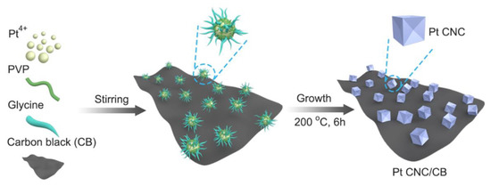 The Pt CNC/CB catalyst was synthesized by using a facile hydrothermal method (Figure 1). A specific amount of CB (3 mg), PVP (MW = 28,000, 800 mg), and glycine (150 mg) were added to deionized water with stirring. After that, 2 mL of H2PtCl6·6H2O solution (40 mM) was added to the above solution and stirred at room temperature for a few minutes. Then, the as-prepared homogeneous solution was transferred to a Teflon-lined stainless-steel autoclave. The sealed vessel was held at 200 °C for 6 h before it cooled down to room temperature. The products were separated by centrifugation at 10,000 rpm for 15 min and were then purified by washing with ethanol three times.