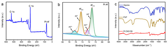 XPS survey spectrum of Pt CNC/CB (a); high-resolution XPS spectrum of Pt 4f (b); FT-IR spectrum of Pt CNC/CB, PVP, and glycine (c).