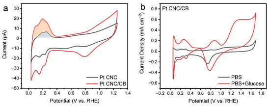 CV curves of Pt CNC/CB and Pt CNC in a 0.5 M H2SO4 solution (a); CV curves of Pt CNC/CB in 0.1 M PBS (pH 7.4) solution with and without 50 mM glucose (b).