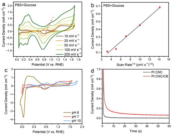 CV curves of Pt CNC/CB in the 0.1 M PBS (pH 7.4) and 50 mM glucose electrolyte at different scan rates (v = 10, 25, 50, 100, and 200 mV s−1) (a); scan rate dependence of the current density for Pt CNC/CB in the 0.1 M PBS (pH 7.4) solution with 50 mM glucose (b); CV curves of Pt CNC/CB in the 0.1 M PBS solution with 50 mM glucose at different pH values (pH = 6, 7, and 10) (c); CA curves of the Pt CNC/CB electrode at 1.279 V in the 0.1 M PBS (pH 7.4) and 50 mM glucose electrolyte (d).