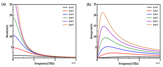 According to Formula (1), there are two factors for the surface conductivity of graphene. The former originates from interband transition and is represented by the symbol . The latter is caused by intraband transition and is marked with symbol . Considering the room temperature and terahertz frequencies here, the Fermi energy in graphene is usually far more than half of the photon energy. Thus, the conductivity of graphene is largely affected by intraband transition, and the influence of interband transition on it almost small enough to be ignored. The process of intraband electron–photon scattering gives a Drude-like dispersion. Therefore, the calculation of conductivity in graphene can be simplified by the following formula [16]: