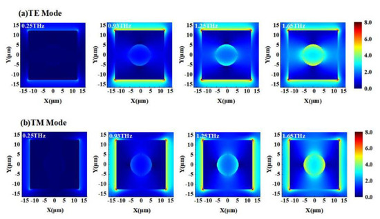 Figure 5 shows the electric-field intensity in the x–y plane at , , , and in TE and TM polarization modes. When at , the surface electric-field was very weak and had a uniform distribution inside the graphene square block. When at , the aggregation effect of the electric-field appeared, and a strong electric-field was mainly concentrated in the upper and lower edges of the graphene square block for TE mode, while in the left and right edges for TM mode. The strongest electric field appeared in the four corners of the graphene square block, the second strongest electric field inside the circular aperture of graphene, and the weakest electric field inside the graphene block. The working mechanism of the absorber can be attributed to a typical absorption, which is realized by electrical and magnetic resonance. The electrical resonance mainly originated from the upper graphene pattern, while the magnetic resonance occurred between the graphene layer and the bottom metal layer. However, as the frequency increased (for example, at ) the electric-field began to extend from both edges of the graphene square block to the circular aperture, and a nearly absorption was obtained. When at , the electric field distribution inside and around the graphene circular aperture was further enhanced, leading to a perfect absorption. This can be explained by local surface plasmon resonance [19]. When the patterned graphene interacted with the terahertz wave, localized plasmons were resonantly excited in both edges of the graphene block and around the circular aperture structure. These two resonances produced a combined effect in the overlapping region and gave a probability of excellent absorption performance [20].