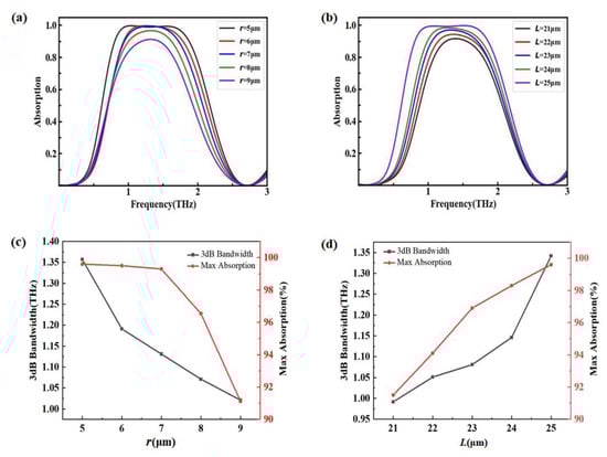 The influence of different geometrical parameters on absorption properties are illustrated in Figure 6. The related parameters were set as , , , and in the simulations. Figure 6a shows the absorption spectrum with different radii . By increasing from to , the absorption decreased and the bandwidth narrowed. When , the maximum absorption was . When , the minimum absorption still reached . The reason for these phenomena is that when the radius increased, not only did the effective resonance length increase, but also the effective area of the graphene square block decreased. Therefore, the absorption showed a trend of gradually decreasing, and the bandwidth showed a trend of narrowing. To clarify further, the bandwidth and the maximum absorption with different are illustrated in Figure 6c. It is clear that both of the bandwidth and the maximum absorption decreased with the increase of radius .