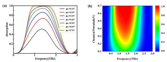 Whether the absorber has dynamic adjustability was one of the important criteria to judge its performance. As an excellent two-dimensional material, the conductivity of graphene has proven to be connected with its chemical potential and can be tuned by photodoping or voltage gating. Thus, by adjusting , the operating frequency and performance of the device could be dynamically regulated. Figure 8a shows the absorption spectra with different , and Figure 8b shows the absorption contour view. When increased from to , the maximum absorption increased from to , and the corresponding bandwidth widened. This was because the conductivity of graphene is related to the chemical potential, which is illustrated by Formula (2) above. When increased, the conductivity of graphene also showed a trend toward increasing, which originated from the increase in the density of the carriers. Once the chemical potential increased to a certain level, graphene behaved like a quasi-metal with high conductivity. In such a case, the incident terahertz wave could excite the localized surface plasmon resonance in graphene. The higher chemical potential may have caused a stronger resonance, thus leading to a broadband and high absorption.