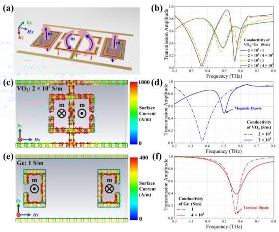 Figure 2a indicates the behaviors of the current directions and magnetic field (H-field) when VO2 bridges are in the metal phase and Ge layers are unexcited, at which time strong resonances occur at the SRRs. Transmission spectra of the proposed metasurface for two materials with or without excitation are plotted in Figure 2b. To examine the working mechanism of the proposed hybrid metasurface, we separately simulated the two parts of the units, and the surface currents are shown in Figure 2c,e. Considering the nonvolatility of VO2, currents can flow through metal phase VO2 bridges after excitation for a certain period, resulting in opposite current loops on SRRI and SRRII surfaces. Such a current distribution motivates a circular closure of the oscillating H-field that rotates around the two SRRs, which characterizes the appearance of the toroidal dipole and vector T in the space []. In the absence of optical pump influence, the conductivity of Ge is approximately equal to 1 S/m, and the current distribution on the surfaces of SRRIII and SRRIV manifests an obvious magnetic dipole type. Figure 2d,f show the simulated transmission spectra for the two different types of resonance modulation. Due to the influence of contrary direction currents flowing on Au electrodes, the resonance intensity of the toroidal dipole is weaker in terms of transmission dip value.