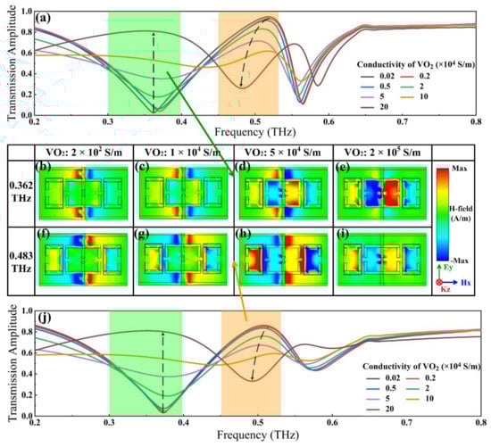 We firstly investigated the electrical tuning properties of the hybrid metasurface by simply varying the conductivity of VO2 bridges in the simulation, and the normalized transmission spectra without or with the optical pump irradiation are depicted in Figure 3a,j, respectively. In the absence of external stimuli, Figure 3a presents a transmission dip of 0.02 located at 0.362 THz, accompanied by a peak of 0.95 appearing at 0.518 THz. With the increase in VO2 conductivity, the transmission valley constantly grew while the peak kept dropping. By fixing the VO2 conductivity at 2 × 105 S/m to imitate the ultimate outcome achieved by electrical stimulation, the transmission amplitude at 0.362 THz reached a maximum of 0.81. Meanwhile, a new dip valued at 0.26 occurred at 0.481 THz. Similarly, supposing Ge conductivity of 4 × 103 S/m, Figure 3j displays transmission amplitudes rising from 0.03 to 0.80 at 0.362 THz, and a peak of 0.86 at 0.508 THz is replaced by the new dip of 0.33 at 0.483 THz alongside the phase transition of VO2. To explain the modifications to transmission spectra, we modeled the alterations to the H-field transmitted through the surface by simply enhancing the VO2 conductivity and fixing the Ge conductivity to 1 S/m at 0.362 THz and 4 × 103 S/m at 0.483 THz, as shown in Figure 3b–i. As observed, the dip nearby 0.362 THz is caused by the strong resonance on both sides of the gold electrodes, where the H-field gathers when VO2 is in the insulator phase. Increasing the conductivity of VO2 bridges gradually permitted the flux of currents, thus resulting in a toroidal resonance that affected SRRI and SRRII. This was followed by a certain coupling resonance with SRRIII and SRRIV, signified by the transmitted H-field inside. Finally, as VO2 conductivity was set to 2 × 105 S/m, the magnetic field surrounding the electrodes tended to vanish, and a toroidal resonance impacted SRRI and SRRII thereby leading to a transmission dip near 0.483 THz.