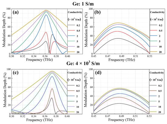 where Ton or Toff represents the transmission amplitude when the device is on or off, respectively. By fixing the conductivity of Ge layers at 1 S/m, Figure 4a,b present MD as a function of frequency in the ranges of 0.30–0.40 THz and 0.45–0.53 THz for varying VO2 conductivity. Constant increments in MD with the elevation of VO2 conductivity were perceived, and the maximum MD values of 97.03% and 69.04% eventually appeared at 0.362 THz and 0.485 THz, respectively. With the conductivity of Ge layers set to 4 × 103 S/m, Figure 4c,d present MD varying with VO2 conductivity in the same frequency ranges, and the maximum MD values of 96.10% and 59.95% appear at 0.372 THz and 0.483 THz, respectively. The frequency shifts of maximum MD are caused by the coupling resonances between SRRs (contributed to by the conductivity of Ge layers), which produces specific influences on the transmission amplitude.