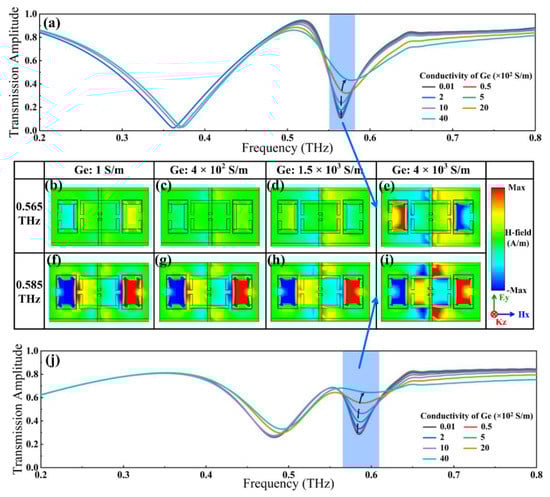 The optical tuning properties of the proposed hybrid metasurface were investigated by simply varying the conductivity of Ge layers in the simulation, and the normalized transmission spectra without and with the electrical voltage excitation are depicted in Figure 5a,j. It was noticed that the transmission valley kept elevating with the increase in the conductivity of Ge layers. Independent of external stimuli, a transmission dip of 0.11 emerged at 0.565 THz, which then gradually rose to 0.469 as the conductivity of Ge layers was set to 4 × 103 S/m. Identically, by fixing VO2 conductivity to 2 × 105 S/m, a transmission dip of 0.285 occurred at 0.585 THz, which finally rose to 0.654 with the enhancement to the conductivity of Ge layers. Supposing VO2 conductivity of 2 × 102 and 2 × 105 S/m, changes in the transmitted H-field with the increase in Ge conductivity at 0.565 and 0.585 THz were observed, as shown in Figure 5b–i. Without optical pumping, the H-field was concentrated inside SRRIII and SRRIV, indicating the predominant position of magnetic dipole resonance in the transmission dip generation. As the Ge layer conductivity elevates, the gradual convergence of the magnetic field toward the electrodes and inside SRRI and SRRII manifests the dropped proportion of the magnetic dipole in the suppressed transmission. Meanwhile, the alternations in the H-field also disclose that other resonance modes are induced due to the interactions with SRRIII, SRRIV, and nearby unit structures. Overall, the resonance strength of the whole unit tends to decline, resulting in improvements in the transmitted H-field and the consequent amelioration of transmission amplitude.