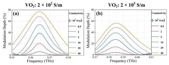 The MD of the metasurface controlled by the optical stimulation was also calculated, as shown in Figure 6a,b. As the conductivity of Ge layers reached 4 × 103 S/m, the maximum MD reached 77.08% at 0.565 THz and 56.36% at 0.585 THz for two different states of VO2 bridges. The reason for the difference can be interpreted by the changing resonance modes between the gold electrodes and SRRI and SRRII, which in turn leads to disparate coupling strengths with the adjacent SRRIII and SRRIV.