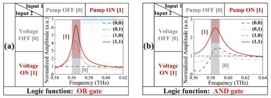 The dual-stimulus-controlled hybrid metasurface is functionalized as a logic (a) OR gate at 0.56–0.57 THz and (b) AND gate at 0.58–0.59 THz.