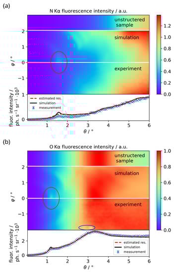 For the calculations of the fluorescence intensities depending on the X-ray standing wave field, a finite-element method (FEM) is used. The electric field distribution is calculated with a Maxwell solver from JCMwave []. The calculation is comparable to the calculation of the GIXRF signal [], but it needs to be adapted for the fluorescence line energies of O K (524 eV) and N K (393 eV). The sample parameters used for the simulations shown in this work are the height , the width of the grating lines , the sidewall angle , the thickness of the silicon oxide layer on top of the grating lines and the thickness of the silicon oxide layer in the grooves . The thickness of the silicon oxide layer between the grating structure and the Si substrate and the pitch were kept constant during the optimization process []. These parameters may also be gained from fitting the simulation to the experimental data shown in this work. More sample parameters, for example, parameters describing irregularities in the sample structure, can potentially be investigated with an appropriate sample model. The densities of the sample materials can be determined with a reference-free approach []. Interference patterns in dependence of the two angles and (--maps, the angular directions are depicted in the side view of the schematic setup in Figure 1) are calculated with an accuracy of within a range from to and from to , leading to a total of 30,401 points of the map for each fluorescence line energy. The simulated fluorescence maps are convolved with a 2D Gaussian with an FWHM of and for the BESSY II measurements and and for the laboratory measurements to account for the angular divergence effects in the experimental data. To estimate this broadening for the BESSY II measurements, a Gaussian footprint of 1 mm × 1 mm is assumed. For the laboratory measurements, the assumed footprint size is mm × mm, with the spot being elongated in the beam direction. From this, 2500 positions are sampled and for each position, emission angles and are calculated for every center of an area of 8 × 8 pixels on the CMOS detector between and . The standard deviations of the 2500 angle values for and in each 8 × 8 pixels area are then averaged to gain a final value for the angular broadening for the pixels in the area. The values for all pixel areas are averaged to produce a mean value. This value is used for the Gaussian broadening. The resulting maps then can be compared to the measurement data. For comparison, an untreated and unstructured sample without the grating structure is simulated as well. The fluorescence profile for the unstructured sample is calculated using the approach of Urbach and de Bokx []. The sample model consists of a 90 nm layer on top of a Si substrate and nm as the top layer.