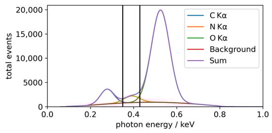 For evaluation of the recorded CMOS frames, single-photon events are evaluated using the clustering algorithm described in []. A compound dark frame is used for background subtraction, and noise thresholds of = 6 and = 3 are applied (see [] for details). In this way, both energy and spatial information from the pixels of the photon events are gained. The energy information of all photon events from all frames recorded in one measurement then yields an energy-dispersive spectrum. The spectrum can be analyzed by setting regions of interest (ROIs) for each fluorescence line. Every photon event contained in the respective ROI can be depicted on the detector frame with its spatial information. Then, the intensity pattern for each fluorescence line can be calculated and represented in a so-called photon map. The energy axes of the energy-dispersive spectra shift slightly depending on the number of the detected pixels of the event, causing potential overlap of neighboring fluorescence peaks. To mitigate this, the spectra are calculated separately for events with the same number of contributing pixels. For each of these spectra, the ROI limits for O K and N K are set manually. The ROI width is reduced so that line overlap is avoided as far as possible, sacrificing counts in the process.