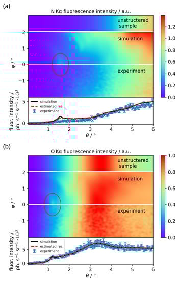 In the following, the results of the laboratory measurements at the BLiX will be discussed. Figure 5 shows the experimental --maps of O K and N K in comparison with the respective simulations. The evaluation process is the same as for the BESSY II measurements, except the -profiles are directly computed using ROIs instead of spectral fitting, since the low statistics lead to artifacts in the latter approach. A Gaussian excitation footprint of × is assumed, caused by the shallow incidence of the excitation beam on the sample mounted on the 10°-wedge. This leads to an angular broadening of and , with which the simulated data are convolved. Again, this broadening is not sufficient to describe the measured angular resolution and a second empirical broadening is also shown.