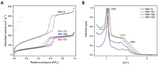 (A) N2 adsorption-desorption isotherms and (B) SAXS patterns of MSNs: SBA-15, SBA-15|1–SBA-15|3.