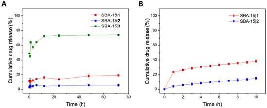 (A) Cumulative drug release (%) of the respective platinum(IV) conjugate from SBA-15|1, SBA-15|2 and SBA-15|3 over 72 h; (B) Cumulative drug release (%) of the respective platinum(IV) conjugate from SBA-15|1 and SBA-15|2 with exchange of the PBS solution every hour for 10 h.