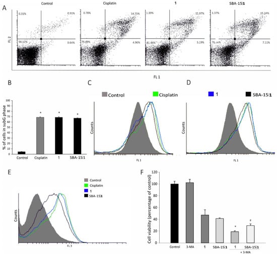 Aiming to get an insight in the plausible mechanism of drug-induced cytotoxicity, flow cytometric evaluation of apoptotic cell death, cell cycle perturbation, rate of cell proliferation, caspase activation, and induction of autophagic response was employed upon treatment of the 4T1 cells with IC50 doses of 1 and cisplatin and an MC50 dose of SBA-15|1. The obtained results reveal that in all applied treatments, induction of massive apoptosis was in the background of diminished cell viability (Figure 5A). In concordance, significant accumulation of fragmented DNA in subG compartment of the cell cycle (Figure 5B), together with a strong caspase activation (Figure 5C) was found in cultures exposed to 1, SBA-15|1 and cisplatin. In parallel, surviving cell subpopulation lost the dividing potential (CFSE assay, Figure 5D). Since the process of autophagy is deeply involved in the cells’ response to toxic stimuli, varying from protective to destructive, it is very important to define the eventual presence of autophagosomes in cultures exposed to the experimental therapeutics [,].