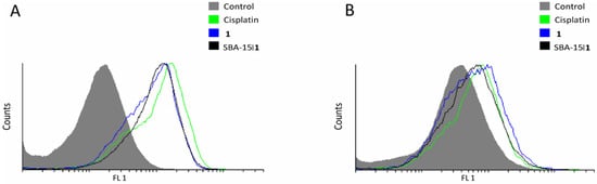 The antiproliferative activity of the free platinum(IV) complexes 1, 2 and 3 and the corresponding MSNs (SBA-15, SBA-15|1–SBA-15|3) was first determined against four human breast tumor cell lines, involving two triple-negative cell lines, namely MDA-MB-468 (human breast adenocarcinoma with COX-2 expression) and HCC1937 (human breast carcinoma with BRCA1 mutation), and the two ER- and PR-positive cell lines MCF-7 (with COX-1 expression) and BT-474 (both invasive ductal breast carcinoma). After 72 h of treatment with the examined compounds and MSNs, the cell viability was assessed using the two distinct assays, CV and MTT, and their activity was compared with that of clinically used cisplatin, as well as the phenolic acids used as ligands. IC50 and MC50 values are presented in Table 2. As expected, the ligands alone were found to be inactive (>100 μM) against all treated tumor cell lines. A similar observation was made for the SBA-15 material (>100 μg mL−1). On the contrary, the platinum(IV) conjugates 1–3 demonstrated antitumor activity in the range similar to (against MDA-MB-468 and HCC1937 cell lines) or higher (against MCF-7 and BT-474 cell lines) than cisplatin. Certain discrepancies were observed between the results acquired by MTT and CV assays against the MCF-7 cell line upon treatment with the platinum(IV) conjugates and against BT-474, HCC1937 and MDA-MB-468 cell lines upon treatment with cisplatin, implying that in these cases the mechanism through which cytotoxicity is achieved might be involving cell metabolism pathways [,,,].