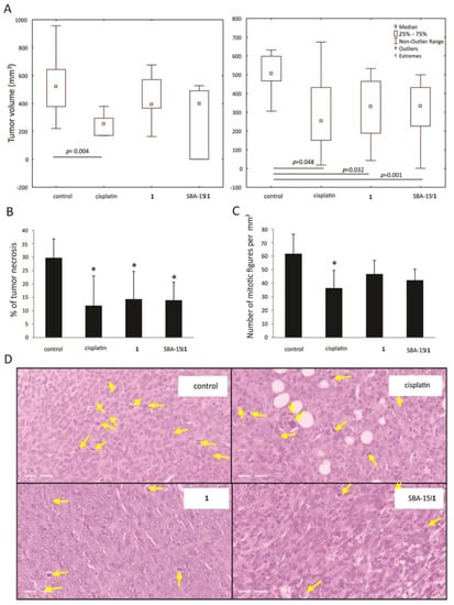 BALB/c mice were orthotopically inoculated with 4T1 cells (2 × 104 cells in 50 µL PBS) in the fat pad region of the fourth mammary gland region. On the fifth day following cell implantation when tumors were palpable, random assignment of the animals into different treatment groups was made. The administration regime consisted of i.p. application of the appropriate agent three times a week. Cisplatin was applied in a dose of 2 mg kg−1 in 2% DMF/PBS, conjugate 1 at 5 and 10 mg kg−1 in 2% DMSO/PBS, while SBA-15|1 was applied in PBS at a dose of 17.5 and 35 mg kg−1 for 25 days. Control mice were receiving 2% DMSO/PBS and 2% DMF/PBS as vehicle. Tumor growth was monitored every second day and on the 29th day after cell inoculation, mice were sacrificed. Tumors were extracted and measured in three dimensions. The tumor volume was calculated based on the following equation:
