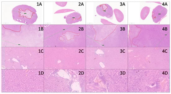 Harvested tissues of sacrificed animals (tumor, liver and kidney) were macroscopically examined, measured and sectioned to 3 mm thick slices through the largest tissue plane. Tissues were processed in automatic tissue processor (Milestone SRL LOGOS ONE, Sorisole, BG–Italy). Embedding in paraffin blocks was done on embedding console (SAKURA Tissue-Tek TEC 5, Sakura Finetek, CA, USA). Sections 4 µm thick were cut from the tissue using microtome (LEICA RM 2245, (Leica Biosystems, Nussloch, Germany), and the slices were mounted on glass slides. The slides were then stained with hematoxilin eosin stain (H/E) in automated slide stainer MYREVA SS-30H (Especialidades Médicas MYR, S.L., Tarragona, Spain). After H/E staining, all glass slides were examined and microscopically analyzed under an Olympus BX43 microscope (OLYMPUS EUROPA HOLDING GMBH, Hamburg, Germany). Additionally, all slides were digitalized with a Leica Aperio AT2 slide scanner (Leica Biosystems, Nussloch GmbH, Germany) for analysis and documentation purposes. Morphometric analysis was done with a Leica Aperio ImageScope (version 12.4.6, Leica Biosystems, Nussloch GmbH, Germany).