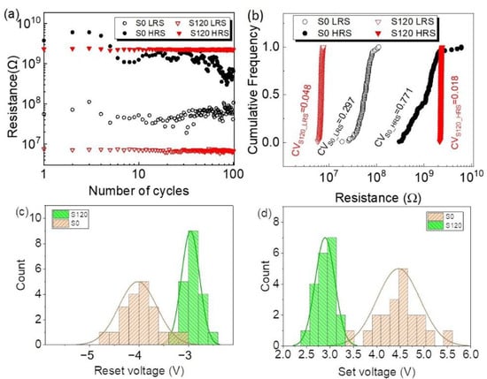 To further investigate the non-volatile bistable storage properties, the resistances of the HRS and LRS during 100 consecutive switching cycles were studied. As presented in Figure 3a, the HRS resistances of the device S0 gradually decreased during the switching cycles, though its resistances were greater than those of device S120 at the beginning. As for the LRS, the resistances of device S120 were much smaller than those of device S0. As a result, the ON/OFF resistance ratio increased with the addition of the copper nanoparticles from ~20 to ~330 to provide a much larger space to accommodate multiple storage states. To evaluate the reproducibility of the device resistance, the coefficient of variation (CV), defined as the ratio of the standard deviation to the mean, was utilized. The resistance CVs for the HRS and LRS decreases with the addition of the copper nanoparticles, as shown in Figure 3b, suggesting an improved resistance reproducibility with the embedment of copper nanoparticles. To count the operational voltages, the set voltage was defined as the voltage setting the operational current at half of the maximum, while the reset voltage was defined as the voltage dropping the operational current to half of the maximum. We then randomly selected 20 devices from each device category to count the operational voltages. As shown in Figure 3c,d, most of the set voltages and the reset voltages decreased with the embedment of copper nanoparticles with the counts matching a Gaussian distribution (fitting lines in Figure 3c,d). The narrower full-width at half of the maximum (FWHM) for device S120 further suggested the improved uniformity with the addition of copper nanoparticles.