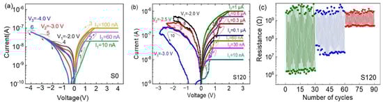 The multilevel resistive switching properties of a memristor indicate several resistance states or conductance states that might be acquired by setting current-compliances (Ic) or voltage-compliances (Vc). If the conductance states represent synaptic weights, the simulations of synaptic behaviors by the device might be possible. If the resistance states are sustainable, non-volatile multi-state storage might be realized. Therefore, the multilevel resistive switching properties of the devices were then evaluated by setting gradually increasing values of Ic. As shown in Figure 4a, the device S0 completed its set process by three rounds with three increased values of Ic. We observed that the beginning of the I–V curve of each round did not overlap the end of the I–V curve of the last round, which indicated that the ending resistance of the last round was probably not stable. Three rounds were also required to complete the reset process with three increased values of Vc. Similarly, the I–V curves of the successive rounds did not overlap during the reset process, suggesting the possibly instable resistance of the storage states. However, the embedment of copper nanoparticles brought some changes. The beginning of the I–V curve of each round well overlapped the end of the I–V curve of the last round during the set process and the reset process as shown in Figure 4b, which indicated that the ending resistance of each round might be reserved to favor multi-state storage. The easy identification of storage states is another important factor for multi-state storage, but the ON/OFF resistance ratio of device S0 was much smaller than that of device S120. The identification of multiple storage states in device S0 might not be easy as instable resistance states challenge the effective identification of states with a small ON/OFF resistance ratio (~20), so device S120 might thus be a better candidate for multistate storage. Therefore, voltage stimuli were applied to device S120 in an initial HRS. Reproducible resistance switching to intermediate resistance states was observed in Figure 4c with acceptable resistance fluctuations, which allowed us to identify four repeatable storage states.