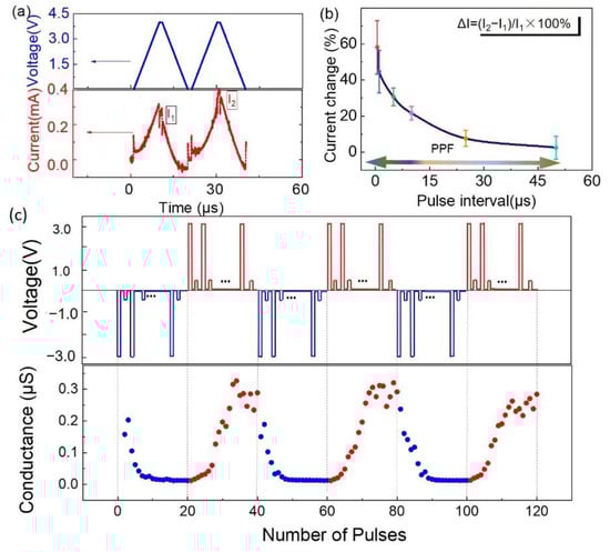 Paired-pulse facilitation (PPF) implementations of the NP-embedded devices with tunable conductance to emulate potentiation (red) and depression (blue); (a) excitatory postsynaptic currents (EPSC) in red with their amplitudes of I1 and I2 stimulated by a pair of presynaptic voltage spikes (blue); (b) current change, defined as (I2 − I1)/I1 × 100%, plotted as a function of pulse interval times; (c) gradual conductance modulation for the devices under pulse stimulation is shown on the top.