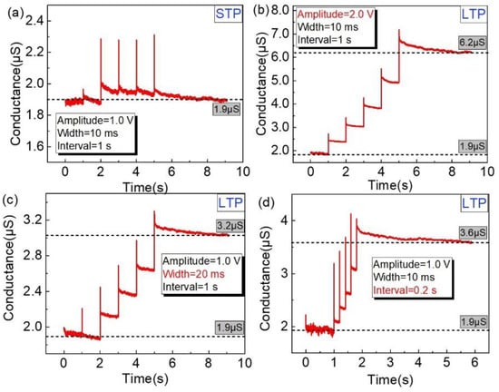 Short-term plasticity (STP) and long-term plasticity (LTP) are fundamental to memory in the human brain [48,49]. Electrical pulses with an amplitude (V) of 1.0 V or 2.0 V, a width (W) of 10 ms or 20 ms and repetition intervals (T) of 0.2 s or 1.0 s were applied to the memristors, as marked in the insets of Figure 7, to evaluate the capability of simulating synaptic plasticity. When input pulses were applied with the lower amplitude of 1.0 V, longer intervals of 1 s and a smaller width of 10 ms, the memristor failed to maintain the higher conductance state (~2.3 µS) and decreased with time back to its initial low conductance value, as shown in Figure 7a, suggesting behavior similar to the STP in a biological synapse. The memristor also presented a long-lived transition to the higher-conductance state with a higher amplitude of 2.0 V, a larger width of 20 ms or shorter intervals of 0.2 s as shown in Figure 7b–d, respectively, which implemented the LTP of a biological synapse as a permanent transition to higher-conductance states in response to the repeated application of input pulses.