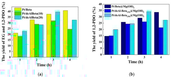 In the previous study of Pt modification on beta zeolite for promoting catalytic efficiency, the Pt loading was less than 1.0 wt% [,,,,]. However, without Mg(OH)2 loading, the induction of Pt inhibits the production of 1,2-PDO in the designed catalysis system. The catalytic performance of the catalysts with different Pt loadings of Mg(OH)2 (7.5 wt%) and without Mg(OH)2 was explored using glucose as the substrate (Figure 2) []. It can be inferred that the loading of Mg(OH)2 dramatically improves the yield of 1,2-PDO. The yield accelerates from 4.5% to 34.1% with Pt loading of 3.0 wt%, increasing approximately eight times. As for Pt/deAl-Beta, there is almost no effect of the loading amount of Pt on the yield of 1,2-PDO, maintaining at approximately 5.0%. With loading the Mg(OH)2, the optimal loading of Pt was reduced by 2%, and the production yield increased by 29.31%, confirming that the Pt usage was reduced. The yield of 1,2-PDO gradually rises with the improvement of Pt load and reaches the maximum with the Pt load of 3.0 wt%. When the load exceeds 3.0 wt%, the catalytic ability gradually decreases. Thus, the optimal Pt load concentration is 3.0 wt%.